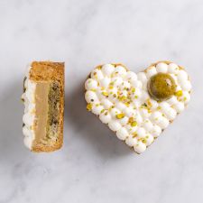 Il est composé d’une couche de fromage filant et crème onctueuse entre deux couches de cheveux d’anges croustillants et dorés au beurre clarifié. Cette version est à la fleur d’oranger parsemée de pistaches