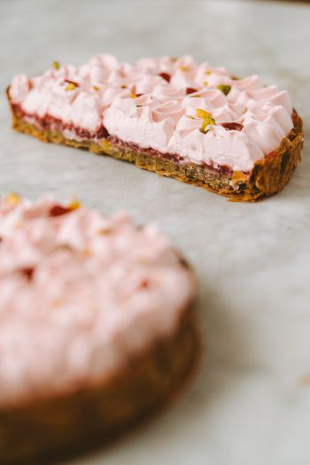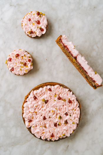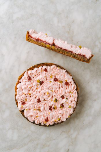 Composée d’un feuilletage à base de pâte filo, emblématique de la maison et qui apporte au gâteau une texture très croustillante et aérienne à la fois. Elle est généreusement garni d’un confit de framboise et d’une crème pistache, le tout surmonté d’une crème onctueuse infusée à la Rose de Damas.
